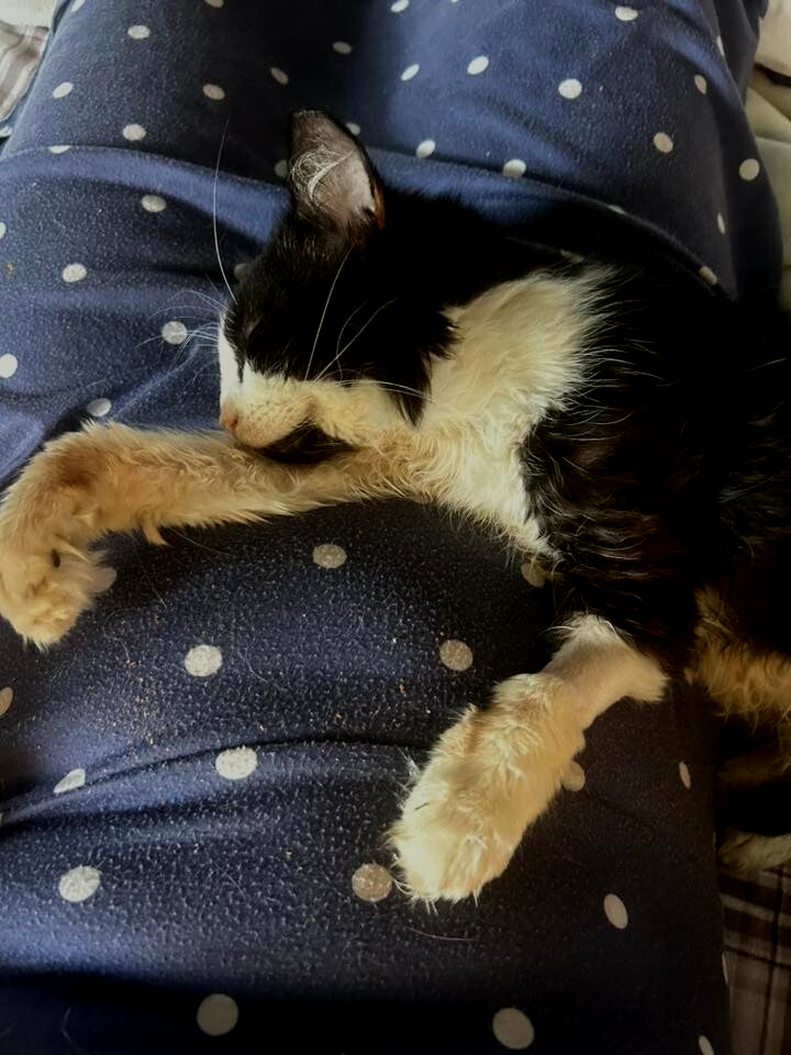 Tux is a neutered male, estimated to be 8–10 years old, with long‑haired tuxedo markings and a tiny frame that still needs a bit of filling out. When he came to the rescue, he was found on the streets, completely matted and in need of a fresh start. After a thorough shave and lots of gentle care, this shy gentleman has begun to show glimpses of the loving boy he truly is. It’s clear he knew a home at some point in his life, and all he needs now is a quiet space where he can feel safe enough to open up.